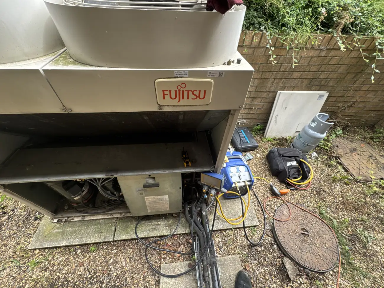 Upon arrival, we discovered the air conditioning installation in a concerning state. The refrigerant gas had been completely removed from the piping network, and whilst a replacement compressor had been fitted under warranty terms, no further work had been completed. The new component remained unwired, without gas charging, and had never undergone proper testing procedures.